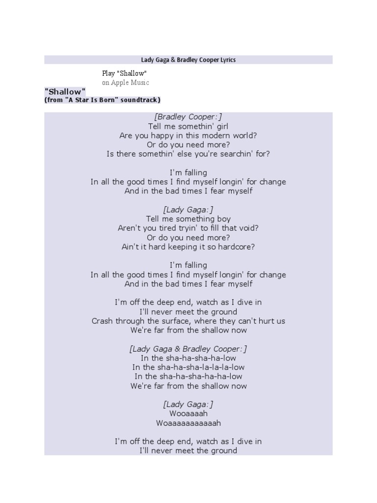 Lady Gaga Bradley Cooper Shallow Lyrics Azlyrics Pdf