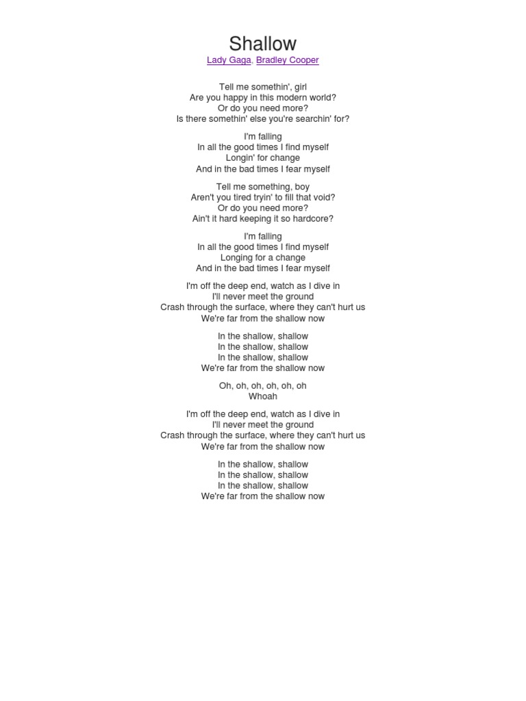 Lady Gaga Bradley Cooper Shallow Lyrics Azlyrics Pdf